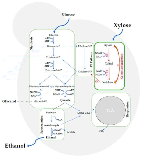 When edible feedstock is used for first-generation bioethanol production, yeast can utilize various sugars to ferment and produce ethanol, where glucose and the glycolytic pathway are central. However, when the lignocellulosic feedstock is used to produce second-generation ethanol, the utilization of xylose, a pentose sugar, becomes critical for the process efficiency. In lignocellulosic hydrolysates, glucose and xylose are present at 60–70% and 30–40% in all sugar compositions, respectively [20]. However, the yeast S. cerevisiae cannot naturally utilize xylose for ethanol fermentation. Thus, S. cerevisiae strains that can efficiently utilize xylose are highly demanded for second-generation ethanol production processes.