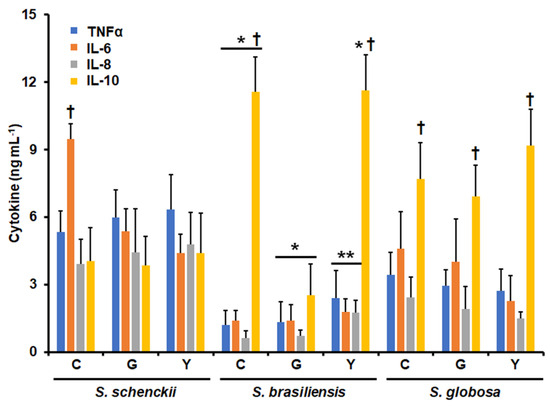 3.1. Differential Cytokine Production by Human Granulocytes Stimulated with Conidia, Germlings, and Yeast-like Cells from Sporothrix schenckii, Sporothrix brasiliensis, and Sporothrix globosa