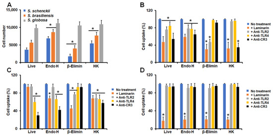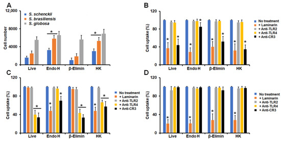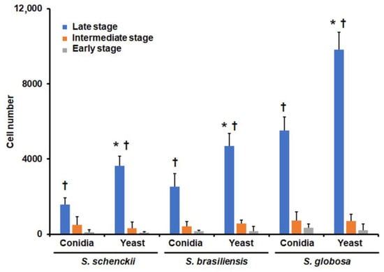 3.2. Differential Phagocytosis of Conidia and Yeast-like Cells from Sporothrix schenckii, Sporothrix brasiliensis, and Sporothrix globosa