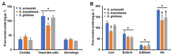 - Lozoya-Pérez, N.E.; Clavijo-Giraldo, D.M.; Martínez-Duncker, I.; García-Carnero, L.C.; López-Ramírez, L.A.; Niño-Vega, G.A.; Mora-Montes, H.M. Influences of the culturing media in the virulence and cell wall of Sporothrix schenckii, Sporothrix brasiliensis, and Sporothrix globosa. J. Fungi. 2020, 6, 323. [Google Scholar] [CrossRef] [PubMed]