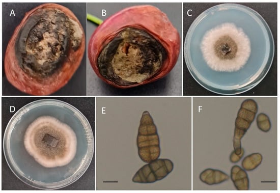 (A,B) Symptoms of Alternaria black rot on naturally infected sweet cherry cv. Regina; (C) colony growth of AASC (strain T8) after 7 days on PDA; (D) colony growth of A. alternata (strain GR13) after 7 days on PDA; (E) conidia of AASC (strain T8) obtained after 15 days on PCA; (F) conidia of A. alternata (strain GR13) obtained after 15 days on PCA. Scale bar: (E,F) = 10 µm.