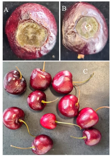Sweet cherries are highly perishable fruit, with a shelf life of 7–14 days [] and they are susceptible, during cold storage, to decay caused by postharvest pathogens, including Monilinia spp., agent of brown rot; Botrytis cinerea, agent of gray mold; Penicillium expansum, agent of blue mold; and Rhizopus spp., agent of soft rot [,,,]. Cherry production could be threatened also by black rot caused by Alternaria species, which is emerging as a major fungal disease [,,]. Symptoms of black rot of Alternaria appear as dark brown to black patches on the outer surface of fruits. These patches gradually increase in size and surface and, under high-humidity conditions, may develop white to light brown, fluffy and moldy growth, and ultimately can cause complete fruit rot [,,].