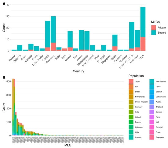 Geographic distributions of mitochondrial multilocus genotypes. (A) Stacked bar graph displaying the counts of private and shared MLGs per region at the “country” level for each region included in the total dataset. (B) Stacked bar graph displaying the geographic distribution of each of the 79 MLGs. Regions at the “country” level are denoted by color, and the y-axis shows the raw strain count for each MLG in the total dataset.