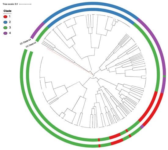 3.2. Phylogenetic Relationships among Strains and MLGs Based on Mitogenome SNPs
