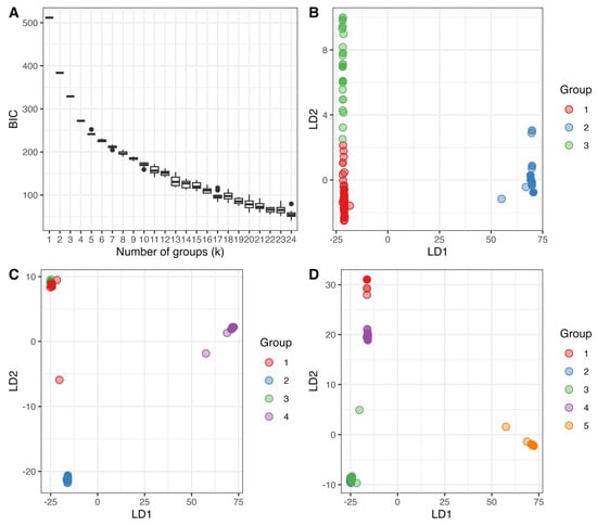 Bayesian Information Criterion (BIC) boxplot and Discriminant Analysis of Principal Components (DAPC) scatterplots based on mitogenome SNPs. (A) BIC boxplot for each putative grouping kernal (k) value for the country-wise clone corrected dataset. BIC values were obtained from 10 repetitions of the find.clusters function in r, which applies successive K-means on Principal Component Analysis (PCA) transformed data then measures for goodness of fit (BIC) of the model. (B) Scatter plot of the first two Discriminant Analysis of Principal Components (DAPC) loadings of the country wise clone corrected dataset when k = 3. Despite groups #1 and #3 clustering close to each other, there is little overlap between them. (C) Scatter plot of the first two DAPC loadings of the country wise clone corrected dataset when k = 4. Noticeable overlap between groups #1 and #3 can be seen in the top left corner of the plot. (D) Scatter plot of the first two DAPC loadings of the country wise clone corrected dataset when k = 5. Noticeable overlap between groups #2 and #3 can be seen in the bottom left corner of the plot.