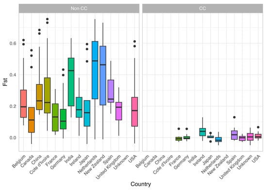 Pairwise Nei’s Fst values for countries with sample sizes exceeding 8 (left) or total MLGs exceeding 8 (right). The left panel was generated using the original sample data original sample data (non-CC), while the right consisted of country-wise clone corrected (CC) data (filtered for sample size post clone correction). The value for each pair of countries is represented twice in each figure, once towards each country in the pair. The thick horizontal line within each colored box is the median, each colored box includes the middle 50% of the data, the lines coming out the box/whiskers are the outer 50% of the data. The dots on top are observed Fst values that exceed 1.5x of the middle 50% of the data.