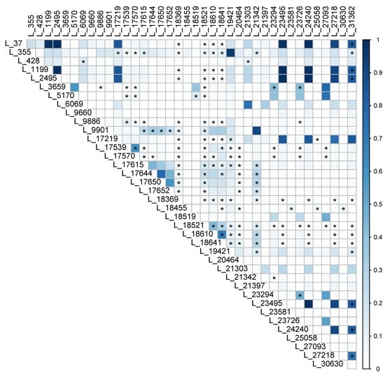 Allelic correlation/linkage disequilibrium and Four Gamete Test results. Color intensity represents r2 value, with higher color intensity indicating higher correlation. Pairs of loci marked with ‘*’ contained all four possible pairs of alleles, indicative of phylogenetic incompatibility and consistent with recombination.