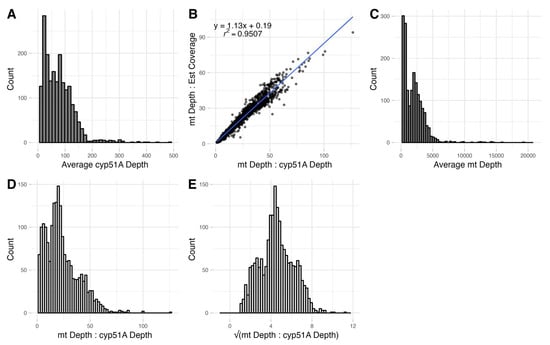 Distributions of sequence read depths and mitogenome to nuclear genome read depth ratios among 1939 isolates of A. fumigatus. (A) Right-skewed histogram of the average cyp51A read depth per isolate, n = 1939. (B) Relationship between mitogenome to cyp51A read depths ratio (x-axis) and the mitogenome read depth to estimated genome coverage ratio (y-axis). The values are strongly correlated with an r2 = 0.9507 (p < 0.01), n = 1929. (C) Right-skewed histogram of the average mt genome read depth per isolate, n = 1939. (D) Histogram of mt genome to cyp51A average read depths ratio displaying heavy right skew, n = 1929. (E) Histogram of the square root transformed values from D displaying a more normal distribution, n = 1929.