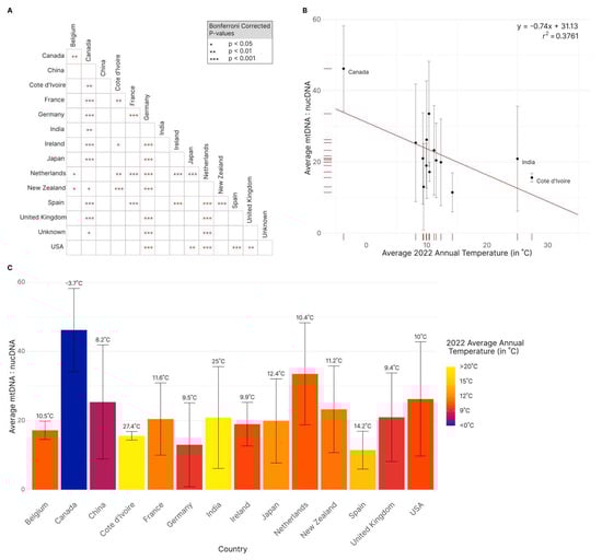 Comparisons between countries in the mitogenome to nuclear genome copy number ratios of strains of Aspergillus fumigatus and its relationship to average temperature in 2022. (A). Pairwise Wilcoxon Rank Sum Tests between countries in their mitogenome to nuclear genome copy number ratios. Significance is denoted by Bonferroni corrected p-values where (*) indicates 95%, (**) indicates 99%, and (***) indicates 99.9% confidence. (B). Scatterplot of countries’ average ratio (± 1 sd) of mitochondria DNA to nuclear DNA against average annual temperature for 2022 (in °C). An overall negative correlation between ratio and temperature (y = −0.74x + 31.13, p < 0.05, r2 = 0.3761) was found. Countries at the two ends of temperature distributions are labeled. (C). Average ratio (± 1 sd) of mitochondrial DNA to nuclear DNA per country. Average 2022 annual temperature in degrees Celsius, is indicated by both color and above each bar. Notably, Canada is 11.9 °C lower than the next coldest country and the only country with an average annual temperature below 0 °C. For all figures, only countries with sample size greater than eight isolates were included.