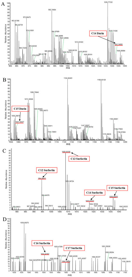 LC-MS/MS for the lipopeptide antibiotics extracted from Bacillus amyloliquefaciens B2. (A) Spectra of inturin A in the range of m/z = 960–1050 Da; (B) spectra of inturin in the range of m/z = 1050–1200 Da; (C) spectra of surfactin in the range of m/z = 1050–1200 Da; (D) spectra of surfactin in the range of m/z = 1050–1200 Da.