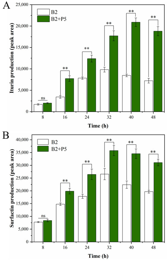 Impact of the Pleurotus ostreatus P5 on the production of iturin A (A) and surfactin (B) by Bacillus amyloliquefaciens B2. Statistical significance was calculated using t-test (ns, no significant difference (p > 0.05); **, p < 0.01).