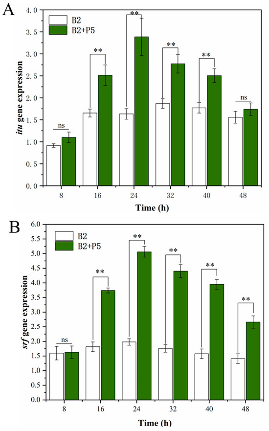 Impact of the Pleurotus ostreatus P5 on the ituA (A) and srf (B) gene expression by Bacillus amyloliquefaciens B2. Statistical significance was calculated using t-test (ns, no significant difference (p > 0.05); **, p < 0.01).