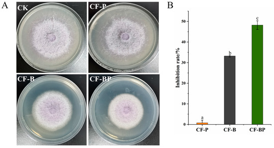 The effect of the co-culture filtrate of Bacillus amyloliquefaciens B2 and Pleurotus ostreatus P5 on FOC growth. (A) Growth inhibition of the co-culture filtrate on FOC. (B) Inhibition rates of the co-culture filtrate on FOC. CF-P, culture filtrate of strain P5. CF-B, culture filtrate of strain B2. CF-BP, co-culture filtrate of strains B2 and P5. Different letters above the bars indicate statistically significant differences according to Duncan’s test (p < 0.05).