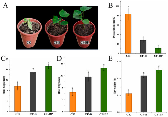 Plant Fusarium wilt suppression and growth promotion by culture filtrates. (A) The growth and disease phenotype of cucumber plant. (B) Disease incidence. (C) Plant height. (D) Root length. (E) Plant dry weight. CF-B, culture filtrate of strain B2. CF-BP, co-culture filtrate of strains B2 and P5. Different letters above the bars indicate statistically significant differences according to Duncan’s test (p < 0.05).