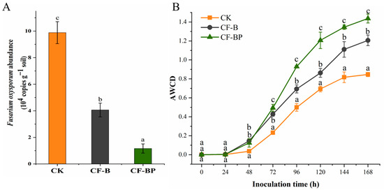 Effect of culture filtrates on the abundances of Fusarium oxysporum (A) and microbial metabolic activities (B) in the cucumber plant rhizosphere soil. CF-B, culture filtrate of strain B2. CF-BP, co-culture filtrate of strains B2 and P5. Different letters above the bars indicate statistically significant differences according to Duncan’s test (p < 0.05).