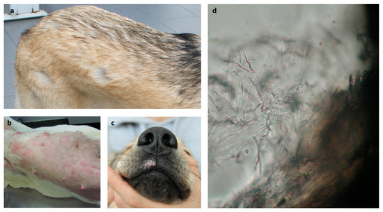 Common dermatomycosis lesion observations in dogs. (a) Spots of alopecia; (b) pruritic inflammatory spots of alopecia (in previously clipped area); (c) pruritic alopecic and depigmented spot; and (d) surrounding hair debris with refringent spores (400×).
