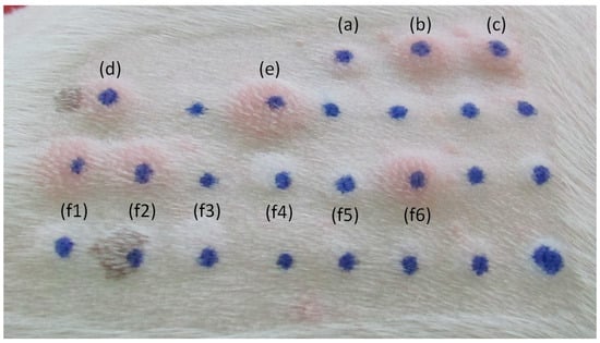 Common IDT reactions in a 0–4 score range in dogs. (a) Negative control; (b) positive control; (c) Phleum pratense; (d) Dactylis glomerata; (e) Malassezia pachydermatis; and (f1–f6) house dust and storage mites.
