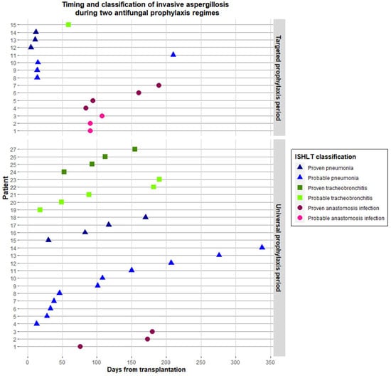 In the first year following transplantation, IA was diagnosed in 27 (14%) and 15 (15%) patients, during the universal and targeted prophylaxis period, respectively. Of these, IA was classified as proven in 41% and 47%, respectively. The distribution of IA as per ISLHT category is summarized in Table S1 and Figure 3. The majority of IA cases were caused by Aspergillus fumigatus (Table S1).