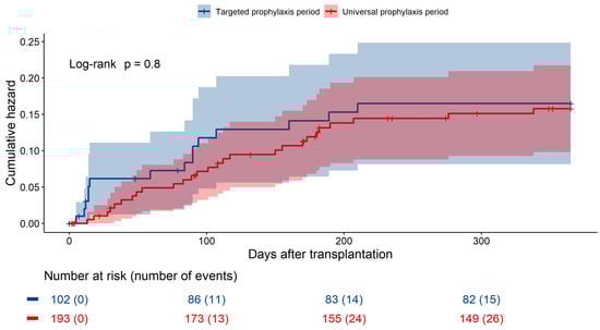 The cumulative hazards of IA in the two prophylaxis periods are visualized in Figure 4. There was no evidence of a difference between the two periods, with an adjusted hazard ratio (aHR) of 0.94 (95% CI 0.49–1.82) (Table 2).