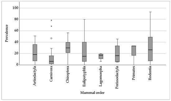 | Lagomorpha (lagomorphs) | Leporidae (rabbits and hares) | Lepus europaeus (European brown hare) [6,16,96,97], Lepus timidus (mountain hare) [96], Oryctolagus cuniculus (rabbit) [6,21,37] |