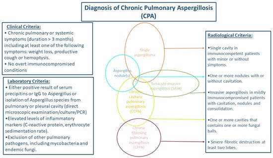 Estimation of CPA prevalence in different geographic regions shows high prevalence in Philippines, Pakistan, and Romania (78, 70, 59 per 100,000 respectively). The estimated prevalence of CPA in different regions appears to have increased in the last decade, probably due to the more precise diagnostic tools and guidelines [7]. The diagnostic criteria for CPA have been defined by the European Society for Clinical Microbiology and Infectious Diseases (ESCMID), the European Respiratory Society (ERS) and the European Confederation of Medical Mycology (ECMM) and include: (i) a consistent appearance in thoracic imaging (preferably by CT) for ≥3 months, (ii) direct evidence of Aspergillus infection or immunological response to Aspergillus spp., and (iii) exclusion of alternative diagnoses [11] (Figure 1).