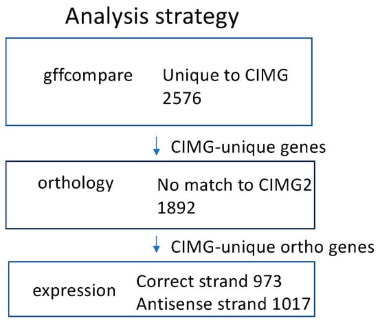 We have focused on the CIMG and CIMG2 annotations because the Augustus algorithm provides no functional annotation for the gene predictions. Protein homology is another approach to comparing gene annotations. The predicted proteins that were found only in the CIMG or CIMG2 annotations by gffcompare were tested for orthology to the alternative prediction using OrthoVenn2. The CIMG-unique genes that lacked CIMG2 orthologs were designated CIMG-unique ortho genes, and the CIMG2-unique predictions that lacked CIMG orthologs were designated CIMG2-unique ortho genes. The overall strategy for identifying CIMG-unique transcripts is shown in Figure 2. An identical strategy was used to identify CIMG2-unique genes.