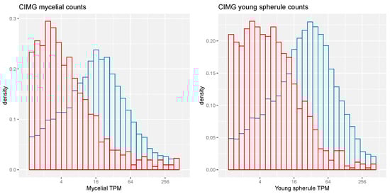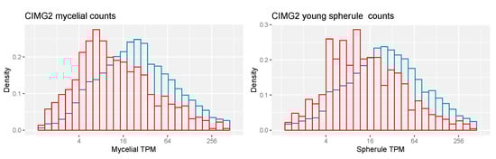 RNA-seq expression CIMG2 and CIMG2-unique ortho-predicted genes. Left—CIMG2 mycelial counts. Right—CIMG2 young spherule counts. Red—CIMG2-unique ortho genes. Blue—all CIMG2 genes. Kolmogotov–Smirnov and Wilcoxon tests, p values < 0.05.