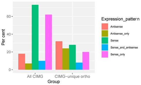 The majority of the total set of CIMG-predicted genes was expressed on the sense strand, and most were expressed exclusively on the sense strand, in contrast to the CIMG-unique ortho set, where a much smaller proportion were expressed on the sense strand (expression was defined as more than 10 TPM). More CIMG-unique ortho-predicted genes were only expressed in the antisense orientation than in the set of all CIMG genes. This finding raises the question of whether CIMG-unique ortho genes with significant antisense expression are valid gene predictions.