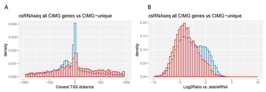 Transcription start sites (TSS) have also been mapped to the CIMG-predicted genes with the capped small RNA-seq technique (csRNA-seq) [24]. This approach reveals that there is usually more than one TSS associated with a predicted gene, and over 95% of the time, TSS were found both upstream and downstream of a predicted gene. When all predicted CIMG genes were compared to CIMG-unique ortho genes, these data showed that the number of TSS per predicted gene was different—3.34 for the unique ortho genes and 2.54 for the total set of genes. In addition, the distribution of the distance of TSS from the CIMG annotation-predicted gene start site was different (Figure 5).