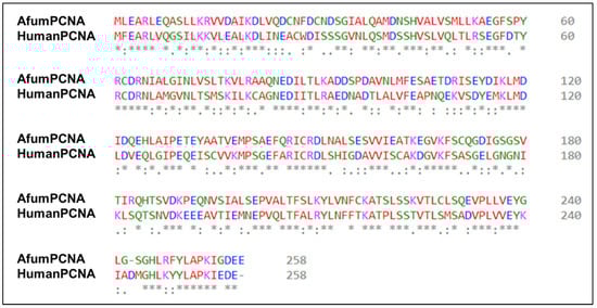 Sequence alignment of afumPCNA (top) (Uniprot: A0A0J5SJF1) vs. Human PCNA (bottom) (Uniprot: P38936). Red residues indicate hydrophobic residues, blue indicates negatively charged residues, pink indicates positively charged residues, and green indicates polar residues. Stars indicate conserved residues. Full stop “.” Indicates residues of shred characteristics. Indicates Semi colon “:” indicates residues of shared characteristics and structure.