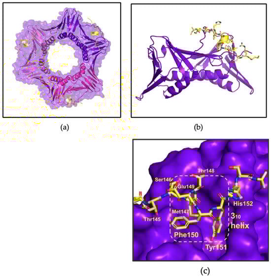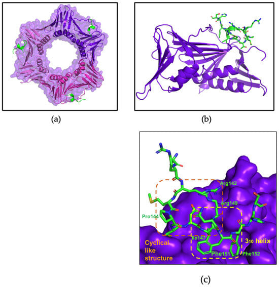 In an effort to target PCNA, the most thoroughly characterised peptide inhibitor is derived from the tumour suppressor protein p21. Protein p21 (also known as cyclin-dependent kinase inhibitor 1), a cyclin-dependent kinase inhibitor, binds hPCNA to outcompete binding partners in order to halt DNA replication for repair systems [], thus regulating the cell cycle during DNA damage. The affinity of peptides derived from p21 binding to hPCNA has been shown to be much higher than other associating proteins [,]. PCNA-interacting proteins, including p21, are allowed access to DNA by interacting with PCNA via the PCNA-interacting protein (PIP) box sequence, Q144X145X146Φ147X148X149Ψ150Ψ151, a consensus sequence in which the glutamine residue (Gln144) binds the ‘Q pocket’ of the PCNA hydrophobic patch, Φ147 represents a hydrophobic residue, and Ψ150 and Ψ151 represent aromatic residues. The sequence and affinity of the PIP-box are theorised to correlate with the protein’s function []. The combination of the hydrophobic residue and two aromatic residues forms a hydrophobic plug that inserts into the PCNA surface and twists the peptide’s backbone from residues 147 to 151 into a 310 helix that is conserved between binding partners. This secondary structure is critical for high-affinity binding. Other interactions that increase affinity are the ionic charged interactions of the C-terminal flank of the PIP-box with the surface of PCNA, and the N-terminal flank of the PIP-box creates an antiparallel β-sheet with the C-terminus of PCNA.