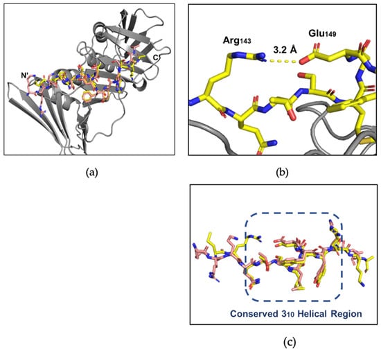 The importance of residues in the non-conserved position of the PIP-box was previously shown to be important in binding to the PCNA surface in the human system []. To probe the effect of altering amino acids in this region of the PIP-box and its affinity to afumPCNA, the peptide was altered from Ser146 to an Arg residue. This produced an affinity of KD 64.4 nM, improved from the p21μ binding affinity of KD 265.1 nM. This was also previously observed in hPCNA, which was hypothesised to be due to an increase in side chain length []. The Ser to Arg variation changes the distance between residues, strengthening the intramolecular hydrogen bond to the carbonyl of Asp149, stabilising the peptide’s 310 helical structure (Figure S10). This suggests that lengthening the side chain would also improve the binding of the p21μ-D149E peptide to afumPCNA; however, an Asp149 modification to Glu showed reduced binding affinity with a KD of 400.6 nM, and this was possibly due to the negatively charged side chain having an unfavourable interaction with the binding surface of afumPCNA (Figure S13).