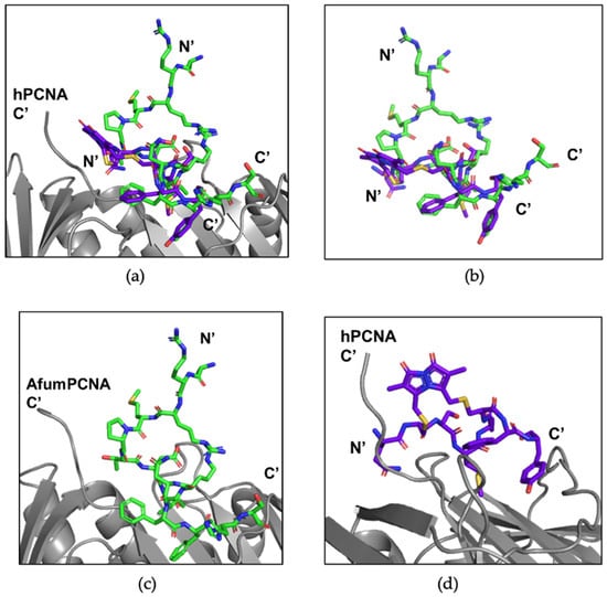 Previous p21-constrained peptides in comparison to the new p21μafumRFC peptide crystal structure. (a) p21μafumRFC peptide (green) crystal structure bound to the afumPCNA monomer (grey). p21μafumRFC peptide (green) produced an affinity of 295 ± 6.9 nM to hPCNA. (b) The Bimane peptide (purple) docked to the hPCNA monomer (grey), as shown in the computational model, produced an affinity of 570 ± 30 nM to hPCNA []. (c) p21μafumRFC peptide (green) superimposed over the Bimane peptide (purple) and hPCNA (grey) computational model. (d) p21μafumRFC peptide (green) superimposed over the Bimane peptide (purple) computational model.