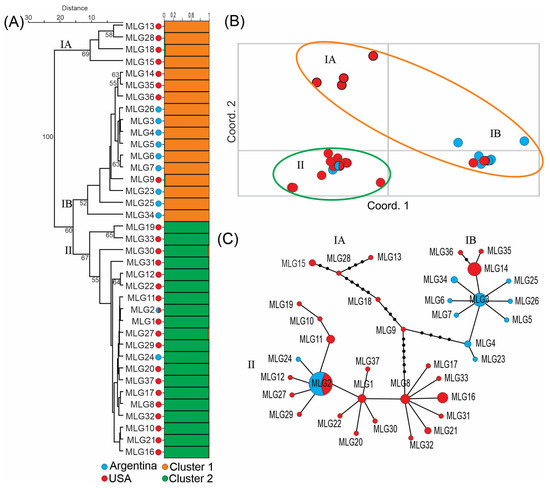 Bayesian analysis predicted that the 37 MLGs most likely belonged to two clusters (Figure S4). Grouping of the 37 MLGs into clusters I and II was shown in Figure 1A (right side). However, UPGMA dendrogram grouped the 37 MLGs into three clusters, IA, IB and II, with over 60% bootstrap support (Figure 1A, left side). The latter was supported by PCoA analysis (Figure 1B) and the minimal spanning tree (Figure 1C). Four MLGs, 13, 15, 18 and 28, all from the USA, formed cluster IA. Cluster IB consisted of nine MLGs (18 strains) from Argentina and four MLGs (11 strains) from the USA. Cluster II consisted of 19 MLGs (40 strains) from the USA and two MLGs (16 strains) from Argentina, including MLG2 that was found in both countries (Figure 1 and Table 1).
