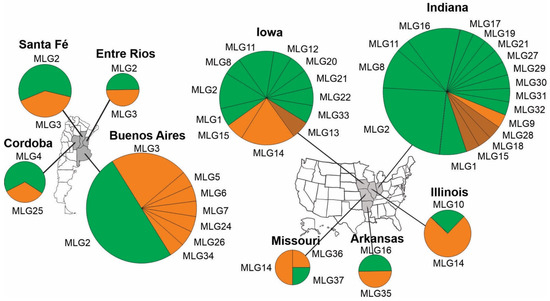 At the state level, MLGs in cluster IB and cluster II were found in all four states in Argentina and all five states in the USA. MLG2, the most dominant MLG in both countries, were found in three states in Argentina (Santa Fe, Entre Rios and Buenos Aires) and two states in the USA (Indiana and Iowa). In Argentina, about half of the strains originated from those three states belonged to MLG2. Indiana was the most sampled state in both countries, with 29 strains belonging to 17 MLGs. Strains and MLGs in cluster II dominated the Indiana collection, and to a lesser extent, the Iowa collection. MLGs in cluster IA were found only in Indiana and Iowa (Figure 2).