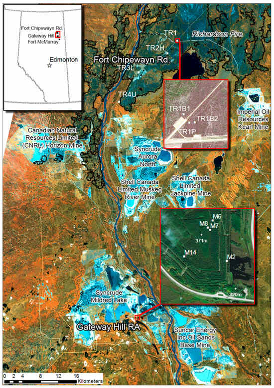 Figure 1. Locations of sampled reclaimed oil sands forest sites at the Gateway Hill Reclamation Area (RA) and forestry sites along the Fort Chipewyan road area within the bitumen mines region north of Fort McMurray, Alberta. See Table 1 for stand descriptions. Sources: Main map—Rapid Eye (acquired 6 September 2012) displayed as NIR, Red Edge and Red in RGB. Blue—unvegetated area such as mines; black—water bodies and cloud shadows; orange—deciduous dominated vegetation; olive green—conifer-dominated vegetation. Richardson 2011 fire boundary derived from interpreted 2012 Landsat composite [27]. Fort Chipewyan Rd. TR1 inset map—2014 Spot6 imagery with pre-fire AVI vegetation cover polygons, courtesy B. Glover, Alberta Dept. Agriculture and Forestry. Gateway Hill RA inset map—2007 imagery from ESRI, Digital Globe, Earthstar Geographics, CNES/Airbus DS, UEDA, USGS, AeroGrid, IGN, and the GI User Community. Cartography by A. Dyk, Canadian Forest Service, Natural Resources Canada, Deforestation monitoring group.
