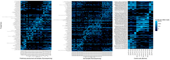 Dereplication was performed on the full length of each sequence set before construction of clusters with USEARCH v.6.0.307 [41]. Reads were agglomerated into clusters, which formed the OTUs, using a sequence similarity threshold of 97% and the most abundant sequence types as cluster seeds. As no single similarity threshold accurately reflects the species level throughout the fungal kingdom, a cutoff of 3% dissimilarity was selected as a compromise to avoid overestimating the fungal diversity and masking cryptic OTUs [37,42,43]. Representative sequences, which were the most frequent sequence in each OTU, were extracted and then screened against relevant databases using local BLAST v.2.2.28+ [33,41,44]. Twenty-five top best BLAST hits were sought in databases by a BLASTn, setting the minimum identity and query coverage parameters to 80%.