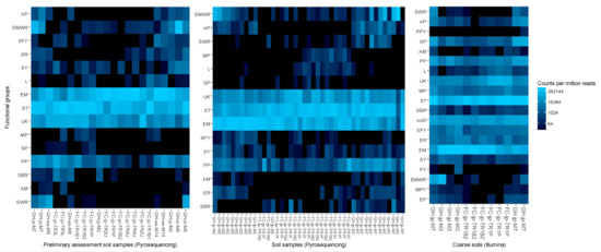 Figure 3. Dissimilarity analyses of the relative abundances of soil fungi functional groups detected by pyrosequencing or Illumina sequencing in jack pine (jp), white spruce (ws), and Siberian larch (sl) stands from the Gateway Hill (GH) and Fort Chipewyan road (FC) areas for all stands in the preliminary assessment and for the jack pine only transects. Heat maps display Bray–Curtis community dissimilarity using non-metric multidimensional scaling (NMDS) ordering of samples on the x-axis and displaying a log4 color scale. The sample order was automatically generated based on radial coordinate angles of ordination axes 1 and 2. UK, unknown function; EM, ectomycorrhizal; AM, arbuscular mycorrhizal; PP, plant pathogen; ST, saprotroph; SY, saprotroph yeast; SFY; saprotroph facultative yeast; SBR, saprotroph brown rot; L, lichenized; SWR, saprotroph white rot; AP, animal parasite; ER; ericoid; MP, mycoparasite; EP, endophyte; SP, saprotroph pathogen; noID, fungal taxa not identified; EMWR, ectomycorrhizal white rot.