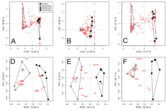 Figure 4. The direct effects of reclamation status (symbol color = stand type, symbol shape = soil fraction), as depicted by partially constrained ordinations of the relative abundances (A,C) and presence/absence (B) of pyrosequenced fungal taxa, the relative abundance of functional groups (E), and the number of fungal taxa belonging to functional groups (D,F) in preliminary assessments of mineral soils (A,B,D,E) and forest floors (C,F), while removing respective variance significantly associated to confounding factors (i.e., spatial components other than PCNM1). Both species and site scores represent unscaled raw eigenvalues. Polygons represent k-means clustering based on axes 1 and 2. Functional group abbreviations in (DF) are defined in the Figure 3 caption. Each red cross represents a unique pyrosequenced fungal taxon.