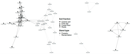 Network analyses of Bray–Curtis distances clustered samples from reclamation sites separately from forestry sites (Figure 5). Samples from reclamation sites were linked only to samples collected along the same transect, while samples from different transects in the forestry sites were interlinked (Figure 5). Clustering samples based on NMDS also grouped reclamation samples separately from forestry samples, whether only taxa with highly variable abundance (Figure 2), the most abundant 250 taxa, or all detected fungi were considered. Fungal communities were dominated by taxa with saprotrophic and EM properties across sites, yet when an unconstrained assessment of the functional properties was conducted, it distinctly grouped each transect and separated reclamation from forestry sites (Figure 3).
