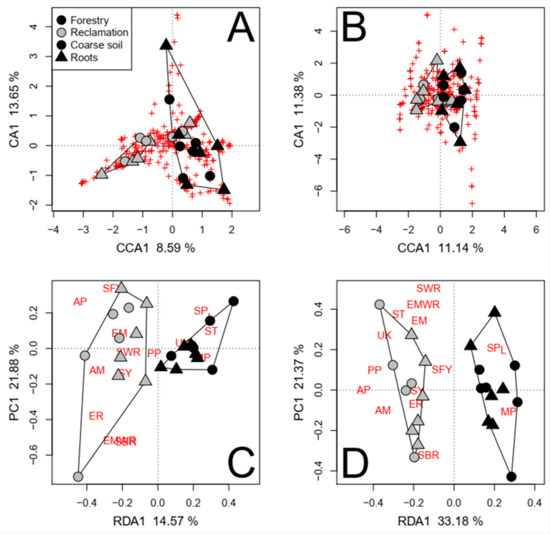 Figure 6. The direct effects of reclamation status (symbol color = stand type, symbol shape = soil fraction), as depicted by partially constrained ordinations of the relative abundances and presence/absence of pyrosequenced fungal taxa ((A,B), respectively), the relative abundance of functional groups (C), and the number of fungal taxa belonging to functional groups (D) in roots and coarse soils in jack pine transects, while removing the effects of soil fraction and respective variance significantly associated to confounding factors (regeneration year, NO3, NH4, total N, and/or PCNM 2). Both species and sites scores represent unscaled raw eigenvalues. Polygons represent k-means clustering based on axes 1 and 2. Each red cross represents a unique pyrosequenced fungal taxon. The functional group abbreviations in (C,D) are defined in the Figure 3 caption.