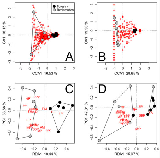 Figure 7. The direct effects of the reclamation status as depicted by partially constrained ordinations of the relative abundances and presence/absence of Illumina-sequenced fungal taxa ((A,B), respectively), the relative abundance of fungal trophic functions (C), and the number of fungal taxa belonging to fungal trophic functions (D) in coarse soils in jack pine transects, while removing the variance associated to the respective significant confounding factors (regeneration year, NO3, NH4, total N, PCNM 2, and/or PCNM 3). Both species and sites scores represent unscaled raw eigenvalues. Polygons represent k-means clustering based on axes 1 and 2. Each red cross represents a unique pyrosequenced fungal taxon.