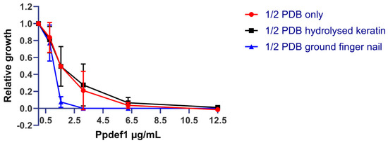 3.5. Ppdef1 Retains Activity against T. rubrum in the Presence of Keratin