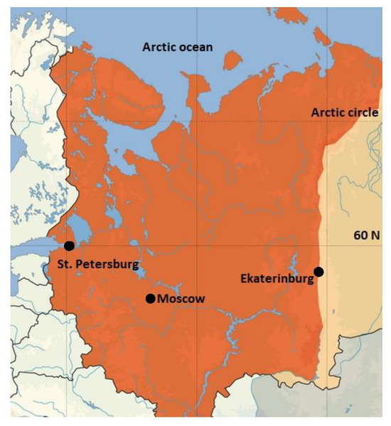 Locations of the three studied cities in Eastern Europe: Saint Petersburg, Moscow, Ekaterinburg.