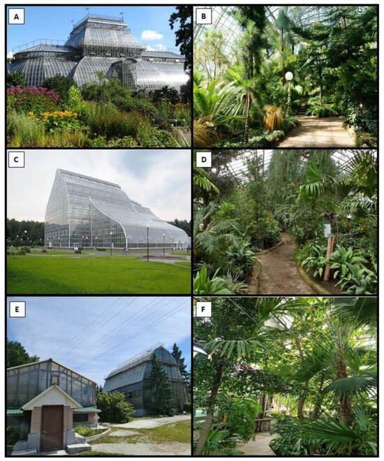 Greenhouses in the studied cities of Eastern Europe. (A,B)—Peter the Great Botanical Garden (Saint-Petersburg); (C,D)—Tsitsin Main Botanical Garden (Moscow); (E,F)—Botanical Garden of Ural Branch of the Russian Academy Sciences (Ekaterinburg).