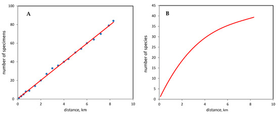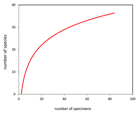 An approach based on the sampling algorithm was used to estimate the expected number of species per transect [42]. This approach is based on a rarefaction curve drawn using a special algorithm for random multiple permutation of data within samples from among the detected samples. An indirect method for assessing the completeness of the identification of species richness was also used—the Turing coefficient (C), which was based on the ratio between the number of singleton species (represented by a single find) and the total number of identified species [43].
