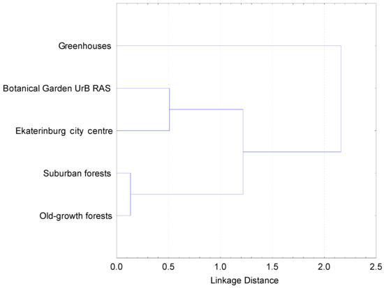 A comparison of the lists of fungal species in the five studied plots indicates that suburban and old-growth forests are clustered together, forest plantations in the city center are combined with the Botanical Garden, and the mycobiota in greenhouses is significantly different (Figure 5).