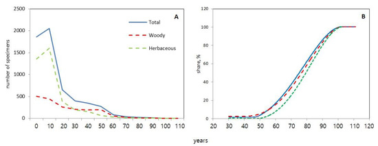 Number of non-native plant specimens (woody, herbaceous and total) in the Ekaterinburg city greenhouses divided into decade groups by decades from the youngest plants of 0–20 years old to the oldest ones of 100–110 years old (A); and the percentage of plant specimens, on which aphyllophoroid fungi fruitbodies were found (B).
