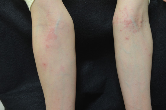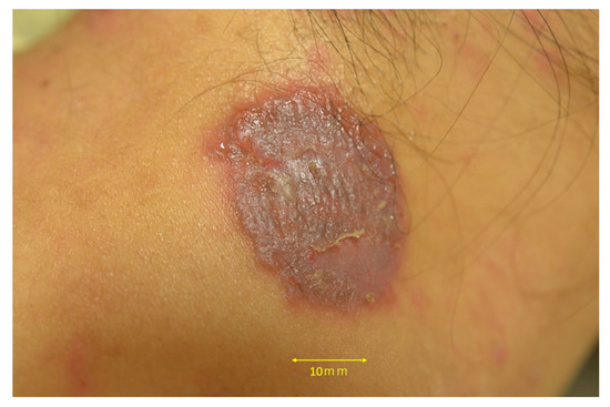 - Yanagihara, M.; Anzawa, K. Tinea corporis caused by Trichophyton benhamiae (Group II). Pract. Dermatol. 2019, 41, 523–526. (In Japanese) [Google Scholar]