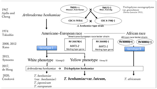 - Kano, R.; Sano, A. A new genotype of Arthroderma benhamiae. Med. Mycol. 2008, 46, 739–744. [Google Scholar] [CrossRef]